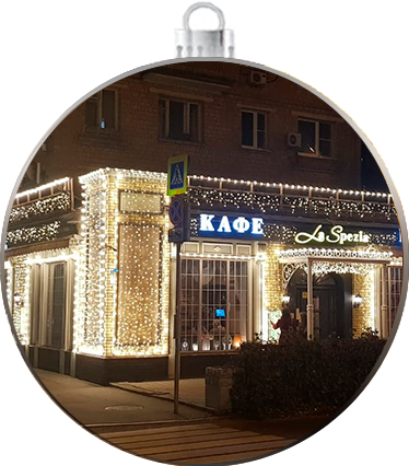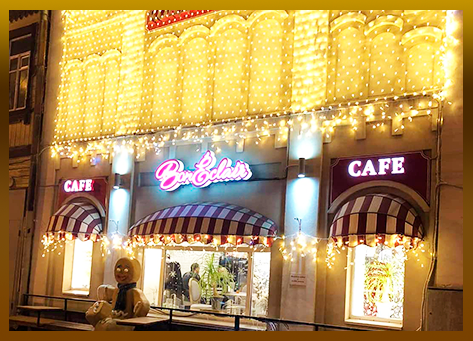 Кондитерская "Бон Эклер" в городе Самара, зажигая каждый вечер огни, создает волшебную атмосферу для посетителей и прохожих, а также поднимает им настроение. Для украшения были использованы бахрома и занавесы теплого света. Это придало зданию очень уютный вид. Бахрома использовалась с самым высоким классом защиты IP65 с дополнительной герметизацией колпачка. Включение бахромы происходит дистанционно, с помощью специального пульта.