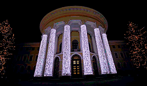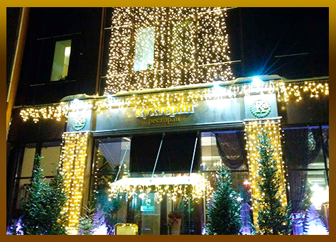 Ресторан премиум-класса "Кухтерин" в Томске радует своих гостей роскошным интерьером, а вечером, включая новогоднюю иллюминацию, восхищает красотой и вызывает улыбку у прохожих. Для украшения использовалась бахрома и занавес теплого света, что создает праздничную атмосферу. Бахрома установлена с самым высоким классом защиты IP65 с дополнительной герметизацией колпачка. Включение бахромы происходит дистанционно, с помощью специального пульта.