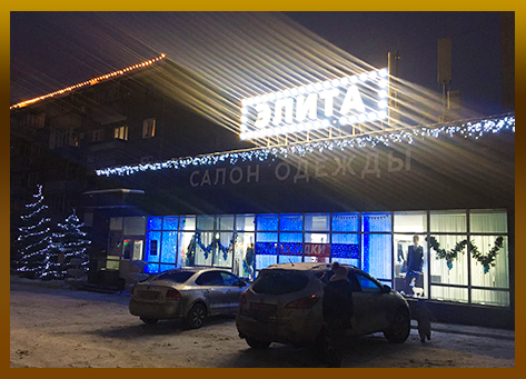 Уютный Бутик "Элита" в Оренбурге создает предпраздничное настроение для своих посетителей, зажигая огни на фасаде здания. Для украшения была использована бахрома холодного света с самым высоким классом защиты IP65 с дополнительной герметизацией колпачка.